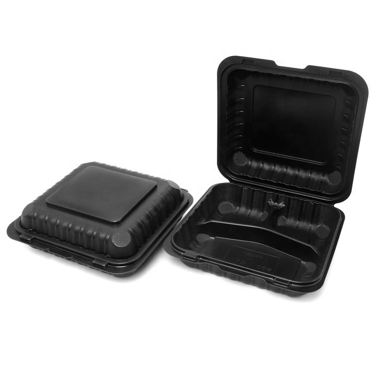 מיכל מזון חד פעמי של צדפה בגודל 8x8 אינץ' עם 3 תאים שחור
